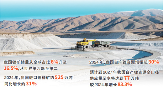 • 我国锂资源储备近期喜讯频传。日前,四川省阿坝州马尔康市党坝锂矿通过自然资源部矿产资源储量评审备案,新增氧化锂资源量44万吨,累计查明氧化锂资源量112.07万吨,成为四川省首个氧化锂资源量超百万吨的花岗伟晶岩型锂矿床,也是迄今为止亚洲探明资源量最大的花岗伟晶岩型锂矿床。不久前,自然资源部宣布,我国锂矿储量从全球占比6%升至16.5%,从世界第六跃至第二。